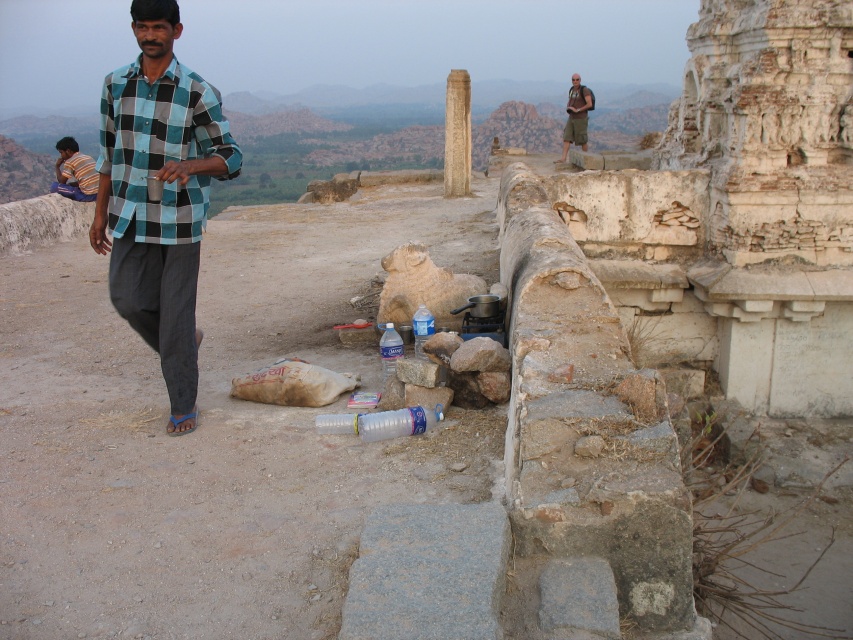 Чем выше я поднимался, тем интереснее становилась картинка местности. В некоторых местах камни выступали отвесно и можно было, встав на край, ощущать себя на вершине мира: ласково пригревало солнышко, приятно обдувал ветерок. Перебравшись на сторону горы, с которой была видна деревня, я обнаружил каменную беседку и присел на край отдохнуть. Снизу из-за валуна возникла голова индуса, пыхтя он взбирался на гору. "Красивый вид", - сказал он мне. "А сверху, где храм, ещё красивей. Я как раз иду туда, могу показать дорогу". "Давай", - сказал я. По дороге индус рассказал мне, что он несёт наверх воду, а скоро подойдёт его товарищ, который принесёт газовую горелку и можно будет попить чай. Ведь скоро закат, а он приведёт с собой туристов. "А вообще-то я продаю открытки с видами Хампи, хотите посмотреть?"