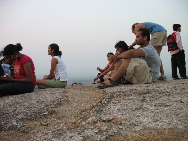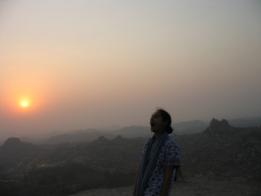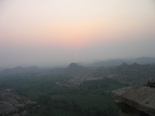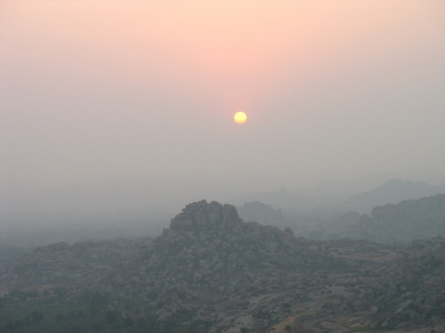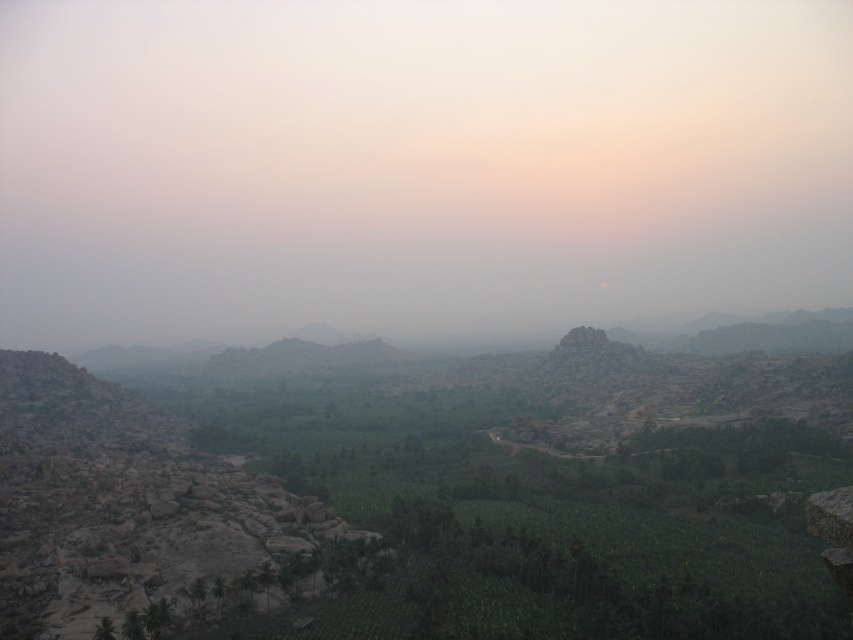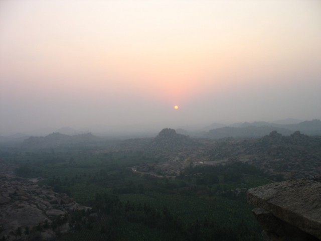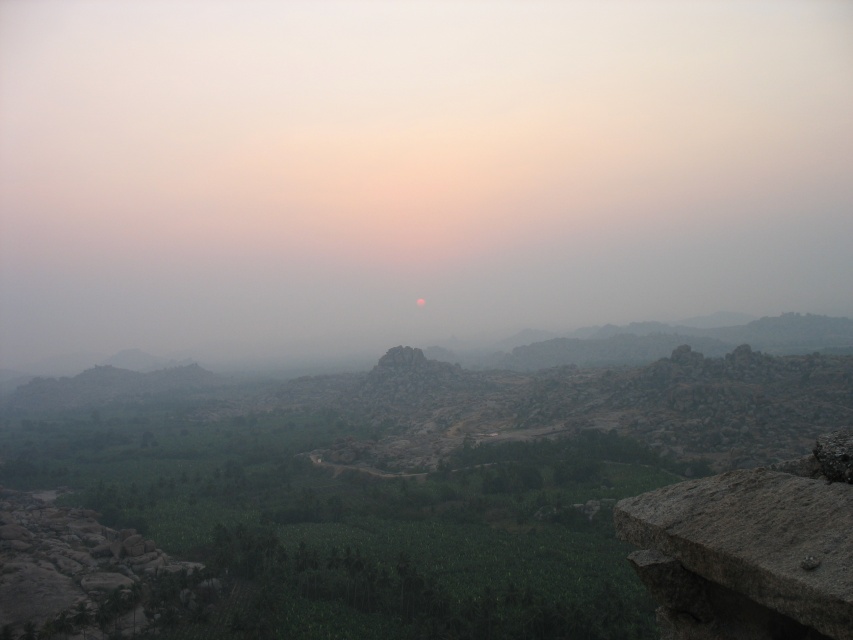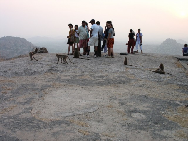 На следующее утро я встал ни свет ни заря (в Хампи это значит 6 утра), умылся, взял фотоаппарат, воду, крем от загара и отправился встречать рассвет на то же место. По прибытии я обнаружил большую группу индийских студентов и студенток, которые заняли всю восточную часть крыши. Вероятно это была организованная турпоездка, так как я встречал некоторых из них позднее при осмотре руинок. На крыше были и некоторые из тех, что провожали закат - практически все вчерашние обезьянки вместе с биг-боссой и индусом, готовившим чай.