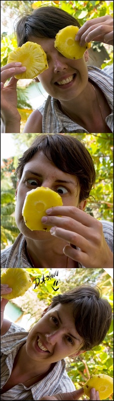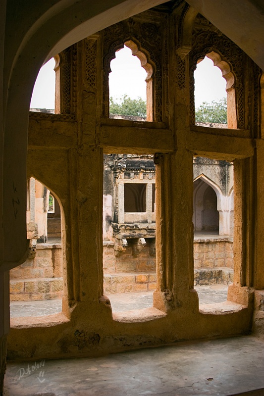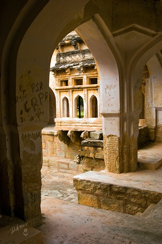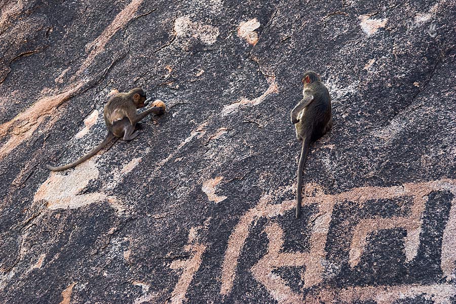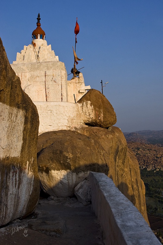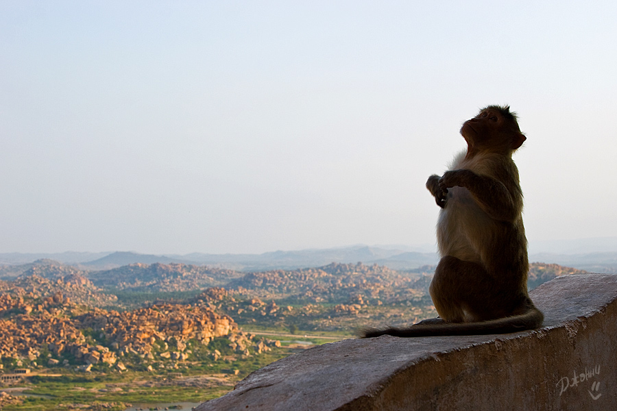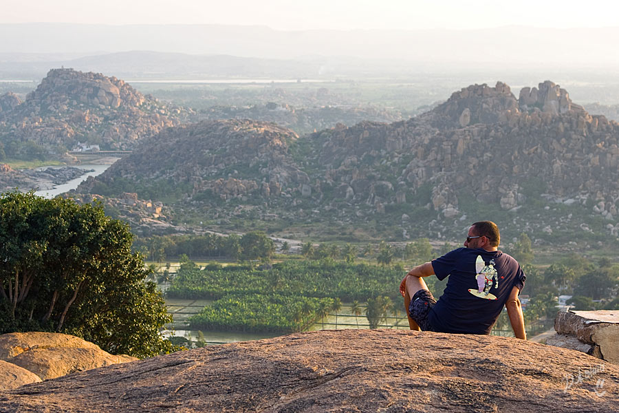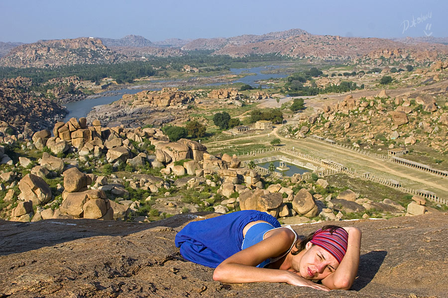 И опять переправа, я затаила дыхание, дальше набережная, узкие улочки и... О-о-о, по правую руку храм Вирупакши, грандиозное сооружение, построенное так давно, что уже никто и не помнит. По левую руку – Хампи Базар. Разинув рты и постоянно оборачиваясь, мы брели по улице, храм возвышался за спиной, толчея тоже оставалась позади, впереди остатки сцены, которую толи собирали, толи разбирали после праздника. Понять не возможно, вокруг никакой активности, воздух плавится, индийцы попрячутся в тени портиков старинных зданий. Мы отважно взбираемся в гору Матанга по камням, отполированным ветрами и тысячами ног паломников и туристов. Есть ли смысл рассказывать о том, что виды привели нас в дикий восторг? И чем дальше в «лес», тем больше адреналина в кровь, эффект первооткрывателя захлестнул и вот мы уже обошли храм Ачьюта Райи, забрались на вершину Матанги и гоняемся за одинокой обезьянкой, чтоб рассмотреть ее и сфотографировать. Но ничего съестного не оказалось и обезьянка не пожелала с нами общаться, вот такая продажная. Солнце, тем временем, клонится к горизонту, но мы никак не можем оторваться от красоты неописуемой, все сидим и смотрим, то фоткаемся и опять сидим, то вдруг такая радость накрыла, что усидеть невозможно, носимся над обрывом, как узники, несправедливо осужденные, но отпущенные на свободу, нарадоваться не можем, сами себе не верим! Мимо по стеночке в противоположном направлении два немецких парнишки двигаются. Нет, не идут, а двигаются, ножками шаркают, не оторвать от камней, ручками нащупывая выступы, чтоб держаться. Весь их вид кричит о том, что их внутренний паникующий голос, ответственный за сохранность внешней оболочки, забил первооткрывательский инстинкт в самый уголок испуганной души. Ребята спросили нас, как мы сюда попали и были немало удивлены, когда я показала на узкую тропинку над пропастью со словами: «This way, guys! Come on!» Их недоверие к моим словам промелькнуло в глазах и чтобы не быть голословной я, продемонстрировала, куда же им все-таки надо, резво пропрыгав туда-обратно ни за что не держась и все время оборачиваясь на них с широкой улыбкой, которая меня так и не отпускала. Они почти мне поверили, но в след прокричали, чтоб я была Carefull! А я предостерегла, что держаться надо правой стороны, иначе Dangerous!