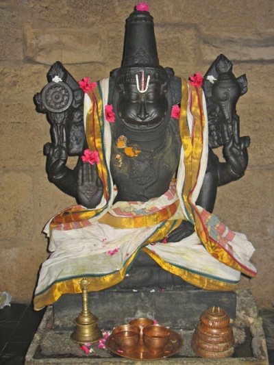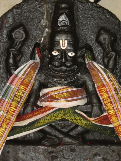 По преданию, именно в этом месте явился на Землю Бог Вишну в виде человекольва: как аватар Нарасимха (Нрисимха). Вкратце, предание гласит, что в этих местах стоял дворец демона Хиранякашипу, который получил от бога Брахны благословение, что его никто и никогда не убьет: ни человек, ни зверь, ни днем, ни ночью, ни оружием, ни голыми руками и тд. У этого демоничного царя был сын Прахлада, который почитал Вишну. Отец, ненавидящий Вишну, постоянно пытался убить Прахлада, но Вишну постоянно защищал его. Однажды он бросил ему вызов, спросив, где живет его Бог Вишну. Тот сказал, что везде. Тогда Хираньякашипу сказал: "Может он и в колонне моего дворца?" С этими словами он ударил по колонне, расколов ее пополам. Из колонны вышло странное существо - получеловек-полулев, положило демона на колени и украсило себя гирляндой из его кишок. Таким образом, Вишну сохранил в силе благословение Брахмы: он был не человеком и не зверем; убил он его ни ночью, ни днем, а в сумерки; ни оружием и ни голыми руками, а львиными когтями и тд.