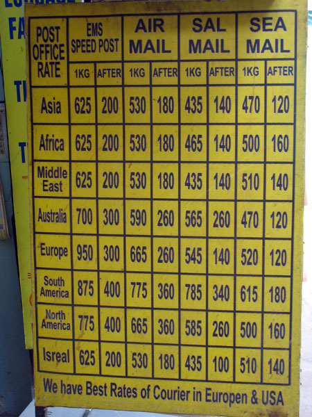 Посылка в Россию авиапочтой весом 1 кг будет стоить около 665 рупий. За каждый последующий килограм - 260 рупий. Для пересылки SAL - 545 и 140 соответственно, для пересылки по морю - 520 и 120 соответственно. Максимальный вес посылки - 20-30 кг (зависит от страны, куда вы ее посылаете).