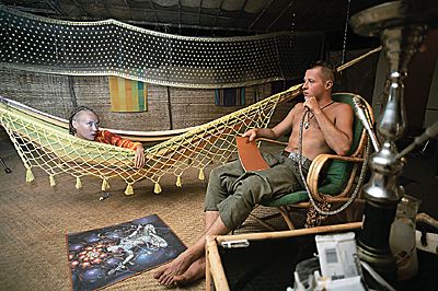 Тут сложно понять, кто есть кто. К примеру, на пляже парочка занимается любовью, откуда-то сбоку тянет травкой, а какой-то хипповатый малый, пристроив лэптоп на худющих коленях, дает своему нью-йоркскому брокеру команду прикупить акций на пару миллионов. Многие так и осели в этих местах, ведя бизнес исключительно при помощи Всемирной паутины. Тут как в русской бане, все равны. Можно вообще прилететь в Гоа без вещей, снять за пять долларов палатку и поселиться в ней на берегу океана. Как и поступил недавно некий известный московский адвокат, имеющий свой офис на Тверской. У всех "русских гоанцев" своя история "переселения в рай". Роман, столичный продюсер, обосновавшийся в Гоа, предпочел элитной квартире в Москве домик в Морджиме с крышей из пальмовых листьев. Он уверен: "Есть две степени свободы. Есть свобода "от" и свобода "для". Вот свобода "для" - это когда ты ее начинаешь применять в творчестве. Гоа - идеальное в этом отношении место для людей, желающих открыть в себе новые таланты. Я вот начал заниматься тем, чем никогда раньше не занимался - организацией огненных шоу. Даже школу специальную для местных открыл".