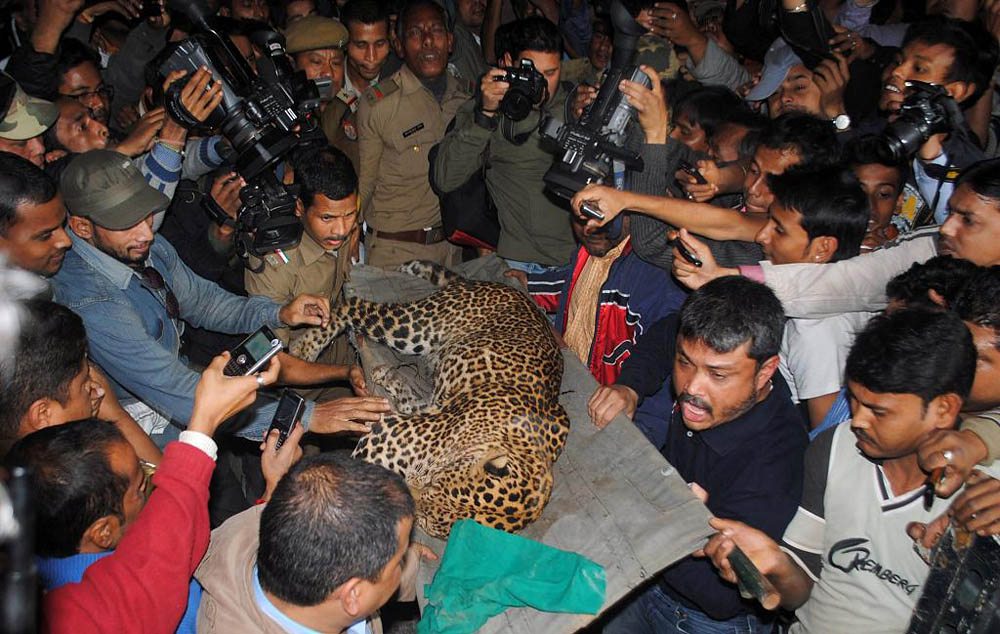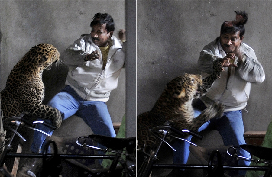 В индийском городе Гувахати, штат Ассам, четыре человека получили ранения в результате нападения леопарда. Хищник зашел на торговую улицу, а когда люди попытались прогнать его, животное напало на горожан. Фотографу Манасу Парану из индийского издания «The Sunday Indian» удалось запечатлеть момент нападения хищника на одну из его жертв. Леопард буквально скальпировал мужчину одним ударом лапы.