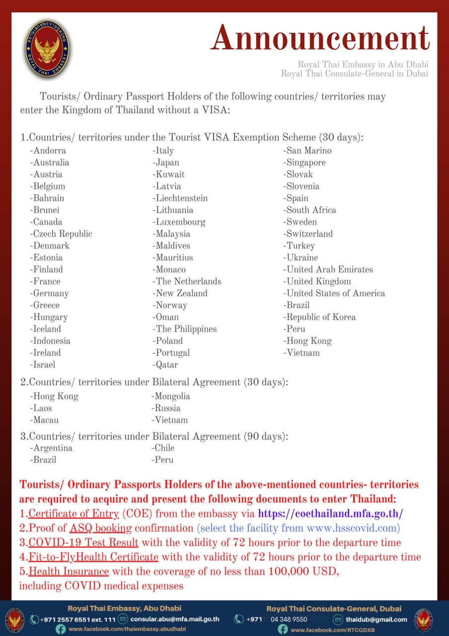 🇹🇭 ❗Таиланд отменил визы для россиян! Теперь для въезда (на 30 дней) нужно иметь только свидетельство о въезде (СОЕ), бронь отеля для прохождения альтернативного государственного карантина (ASQ), результат проведенного не позднее 72 часов до вылета ПЦР-теста на COVID-19, «Медицинское свидетельство о пригодности к полетам» (Fit to Fly) аналогичного срока действия, а также страховку, покрывающую лечение коронавируса, на сумму не менее 100 тысяч долларов.