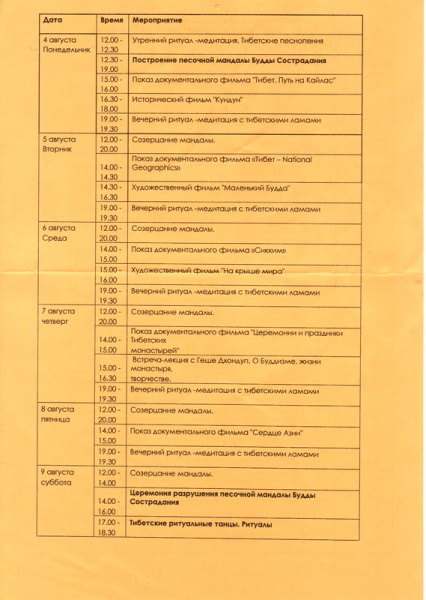 был там сегодня. пришел около 18. мне сказали, что начало построение мандалы Будды Сострадания будет в 19 и продлится каждый день примерно в это же время в течении 5 дней. потом постоит немного и будет торжественное разрушение.